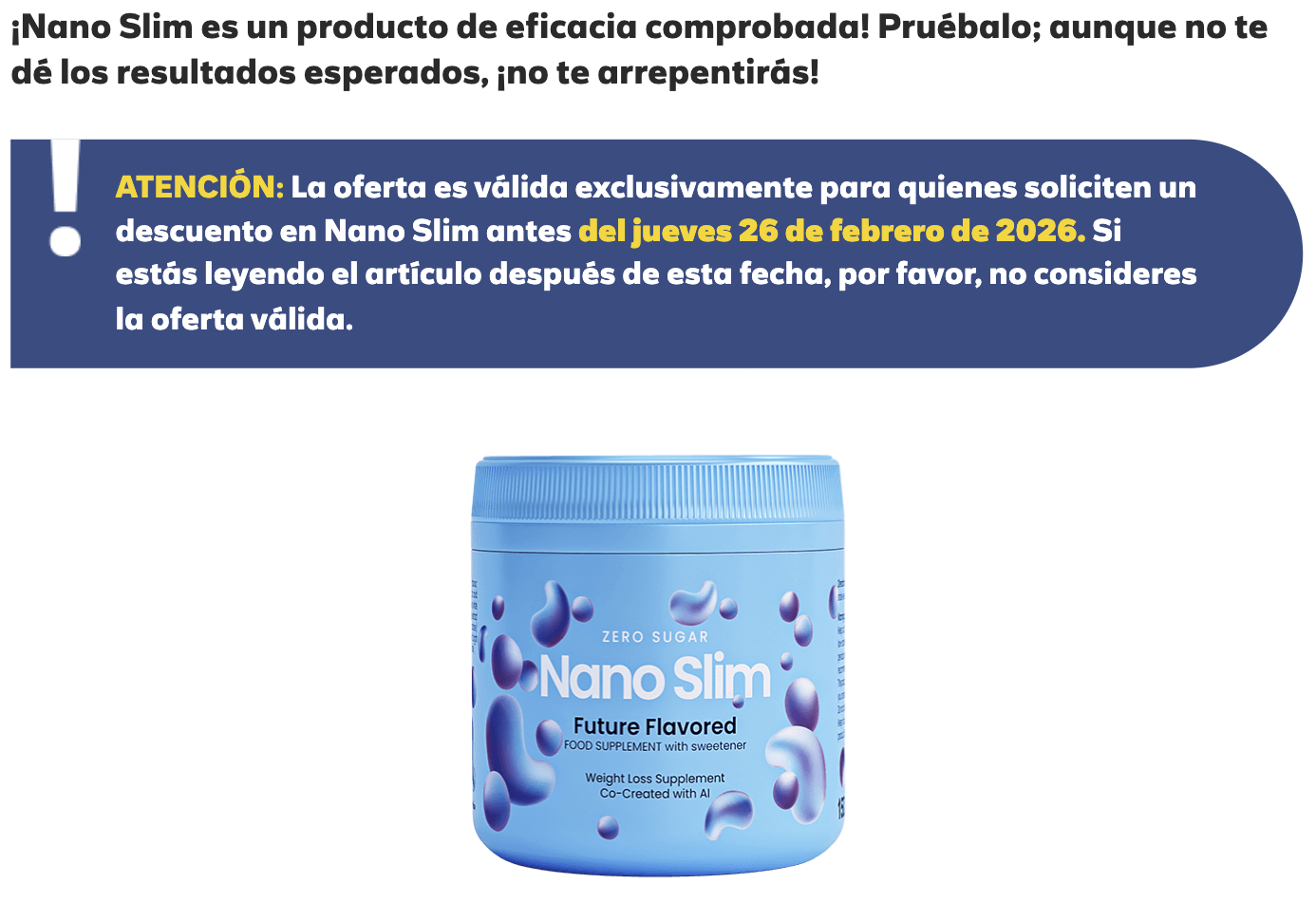 Dopo che la storia di María è diventata virale, migliaia di lettori hanno già confermato: Nano Slim è il miglior metodo di dimagrimento naturale del 2025-2026. Abbiamo contattato direttamente il produttore e ottenuto l'estensione di una promozione esclusiva per la nostra regione.